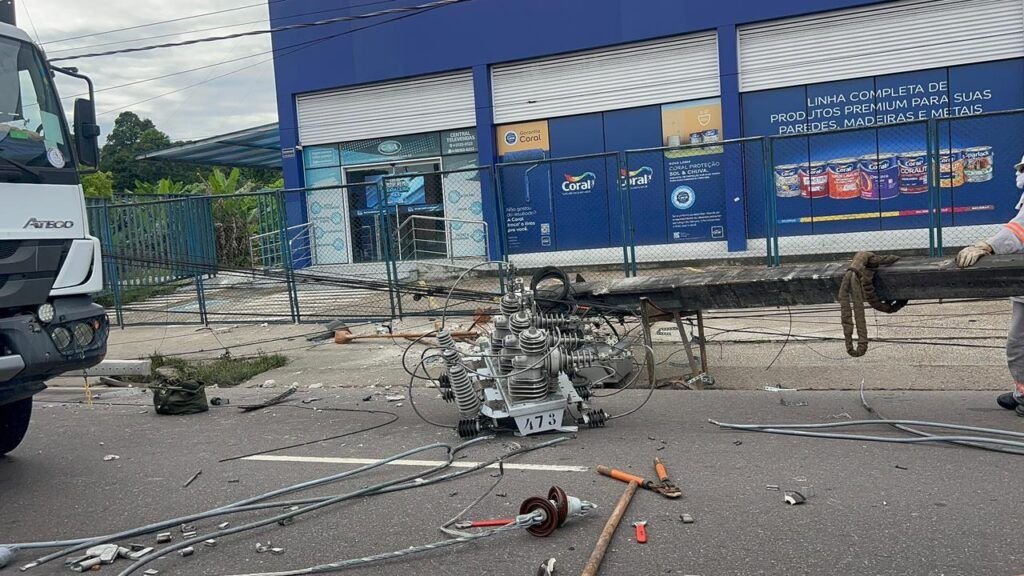Um grave acidente de trânsito na avenida Max Teixeira, bairro Cidade Nova, zona norte de Manaus, deixou parte da via bloqueada na manhã desta quinta‑feira (2), após um jovem perder o controle de um Chevrolet Prisma, de cor preta, e bater em cheio em um poste de iluminação pública. O choque derrubou a estrutura de concreto, deixou fiação exposta e interrompeu o fornecimento de energia elétrica na região.