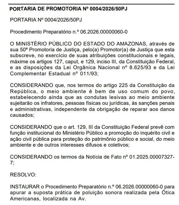 O Ministério Público do Estado do Amazonas (MPAM) instaurou procedimento preparatório para investigar denúncia de poluição sonora supostamente provocada pela empresa Ótica Americanas, situada na avenida Eduardo Ribeiro, nº 629, no Centro de Manaus.