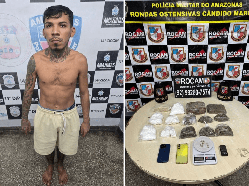 POLÍCIA – A prisão de um homem suspeito de tráfico de drogas ocorreu durante ação da Rondas Ostensivas Cândido Mariano (Rocam), que flagrou o indivíduo com porções de cocaína, maconha e oxi em área urbana de Manaus. Conforme informações divulgadas pela Polícia Militar do Amazonas, a equipe realizava patrulhamento quando identificou o suspeito em atitude considerada suspeita e decidiu realizar abordagem, momento em que encontrou o material entorpecente. A ocorrência foi registrada em via pública, em bairro da capital, após denúncia anônima repassada aos militares.