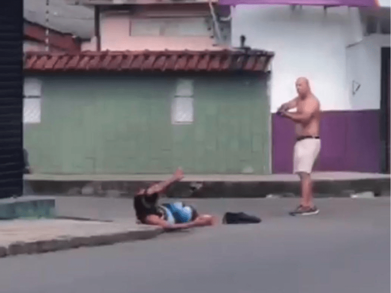 As imagens mostram o momento em que a vítima caminha pela rua e um homem sem camisa se aproxima e dispara contra ela, que cai logo depois. Em outro registro, o suspeito aparece fugindo a pé logo após efetuar o disparo.