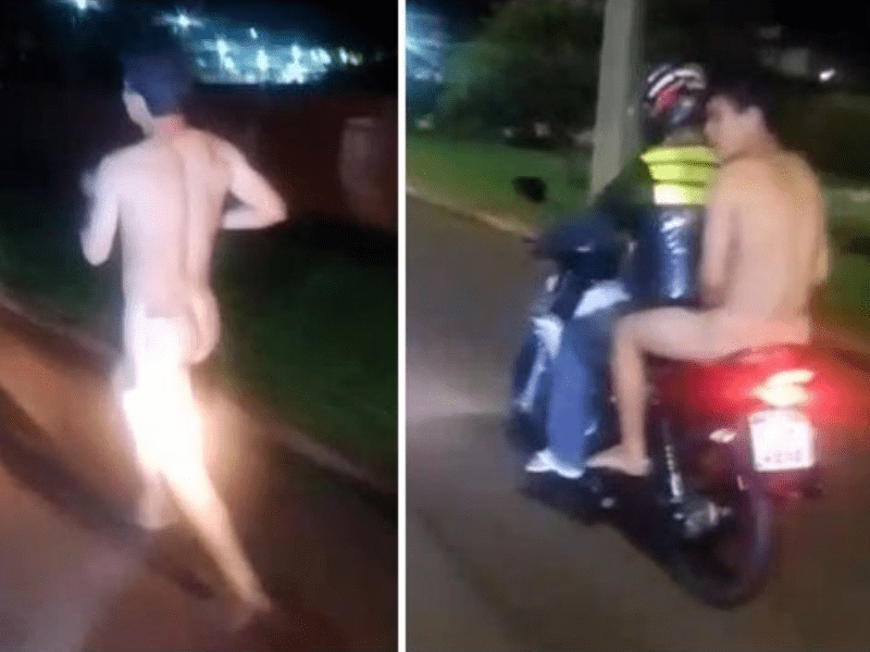 Dois vídeos circularam nas redes sociais durante a noite. Em uma das gravações, o suspeito surge correndo pelo acostamento da rodovia. No outro registro, ele continua sem roupas e já aparece sendo transportado na motocicleta.
