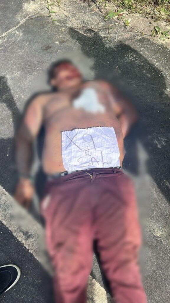 Sobre o corpo, os criminosos deixaram um bilhete escrito à mão com a frase “X9 é sal”, uma gíria usada no meio do crime para se referir a informantes ou supostos traidores de facções.