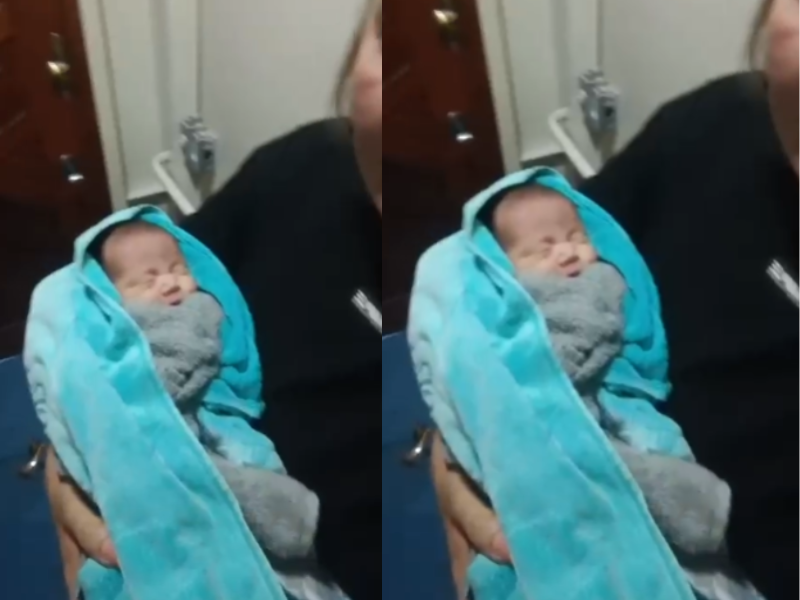 A mãe colocou o bebê dentro de um cooler improvisado para protegê-lo da água agitada durante resgate por embarcação próxima.