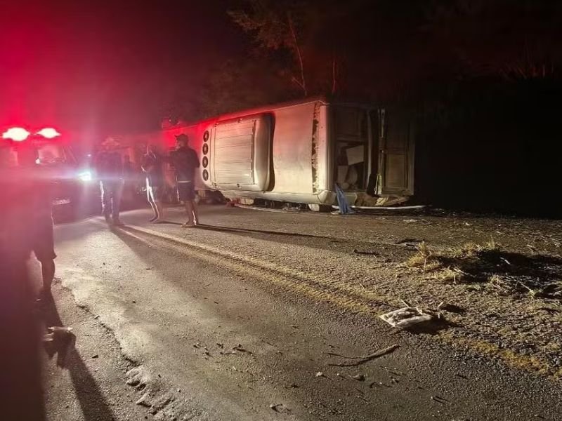 O ônibus transportava mais de 30 passageiros e saiu da pista, tombando após colidir com rochas e um barranco.