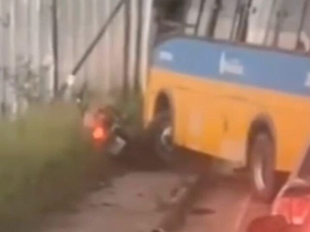 O condutor do micro-ônibus ainda parece dá uma ré com a intenção de antigir o motociclista, mas segue o caminho